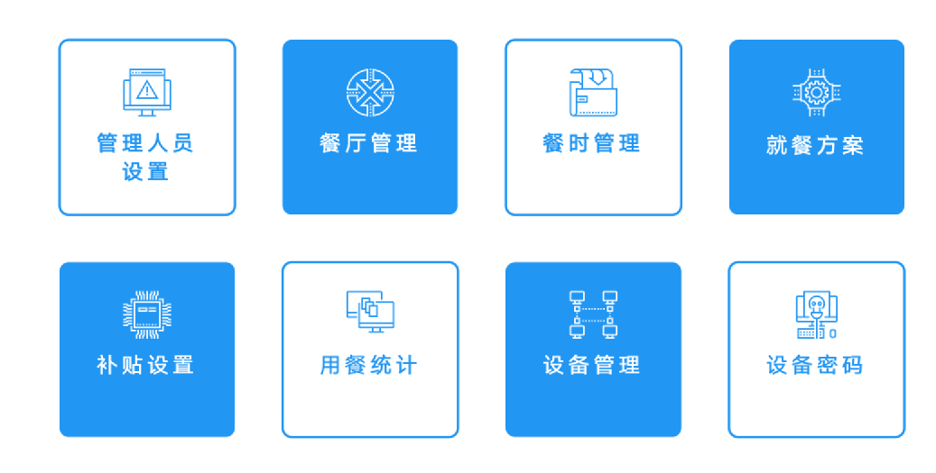 智能支付,支持人脸识别、扫码、指纹识别、刷卡支付及微信等第三方支付;提前订餐,支持手机订餐、电脑端订餐、微信公众号、微信小程序、企业微信、自助订餐机、接待餐预订等多种订餐形式;用餐人数统计,实时显示预订人数、数量、待就餐人数、就餐率、交易流水等信息;排菜管理,支持菜品、套餐、主食、商品等设置与添加;功能定制,支持私有化部署、功能个性化定制、二次开发
