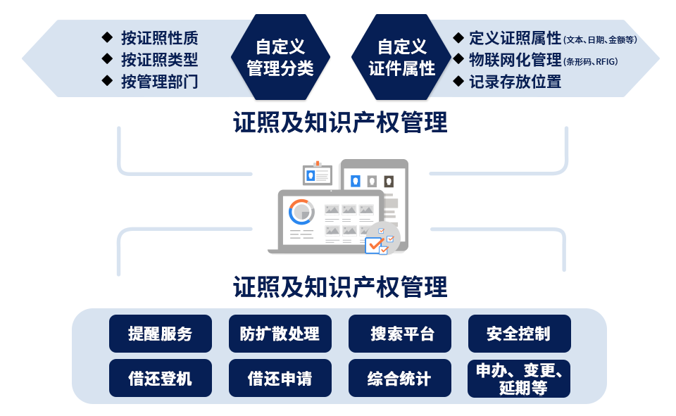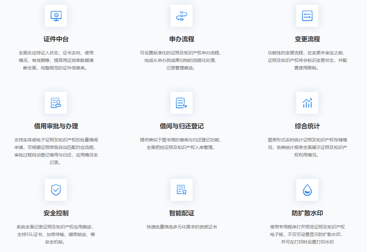 实体与电子证照及知识产权的统一化管理,方便应用,易存易取。证照及知识产权申办、变更、借用等全面流程化处理,管理痕迹全保留。