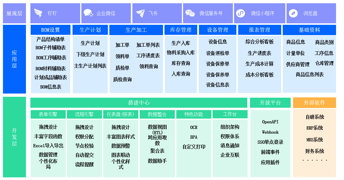 通过开放平台集成能力打通各个系统之间的数据孤岛,实现业务数据互通,实时在线协作,提升产能和效能。基于生产订单及时调整/制定生产计划,协调资源安排生产任务,优化生产流程,提升生产效率和产能。生产流程、采购计划、销售管理和财务核算无缝衔接,实现业务流程自动化,有效配置和管理生产资源。