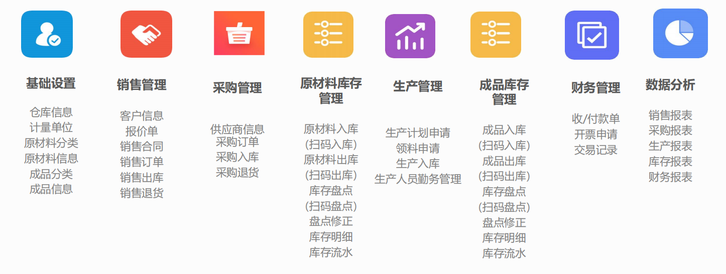 建立完整的生产管理计划与生产入库规则;细化权限分配,可设置不同员工、商品、仓库等权限;打印报表可以自由设置,满足不同单据需求;内含完整的生产、采购、销售等管理模块,更好的制定生产销售策略。