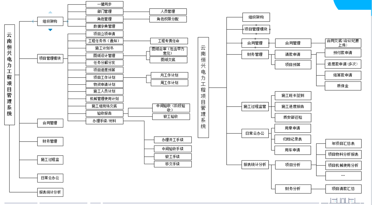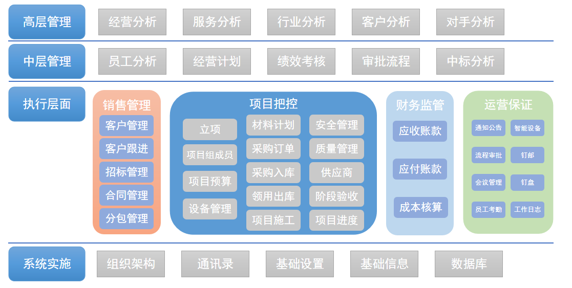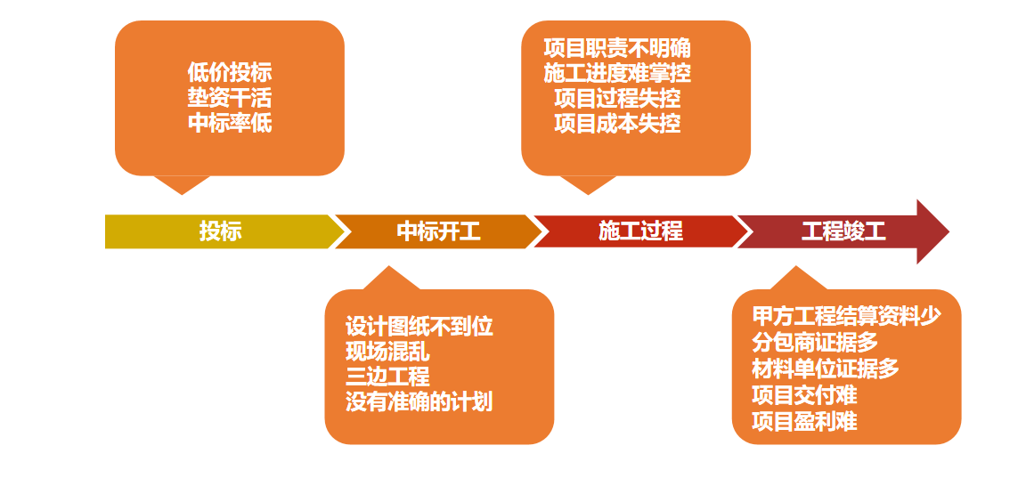 实现工程项目的全过程管理:经营目标为导向、项目管理为核心、成本控制为重点、进度管理为主线。通过精确项目计划以及项目进度的管控,实现项目按时交付做好项目费用预算,材料/外包等成本严格控制,提高盈利项目施工过程及变更的严格控制,降低项目风险通过信息化管理,实现项目人员、材料、设备、资金等项目资源的科学管理通过项目的管理和控制,实现公司经营目标。