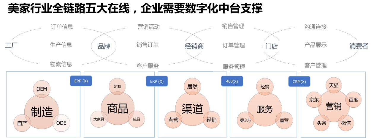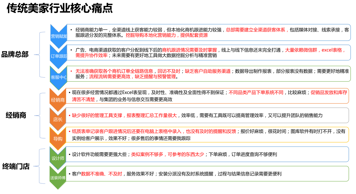 美家行业——前端营销多元化:家居品牌不再单纯依靠品牌广告、本地化活动。更看重线上效果广告、电商平台、设计师平台等多元化营销渠道对接;服务协同高效化:随着消费升级,年轻群体习惯数字化时代的便捷性,终端和总部在业务协同、销售过程中需要更加智能、高效的协同平台支撑。