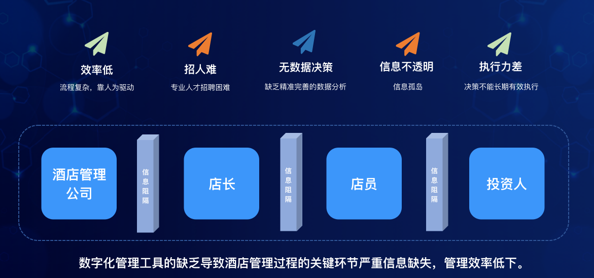 数字化酒店管理升级——酒店管理痛点,流程复杂,靠⼈为驱动效率低;专业⼈才招聘困难,招⼈难;缺乏精准完善的数据分析,⽆数据决策;信息孤岛,信息不透明;决策不能⻓期有效执⾏,执⾏⼒差。