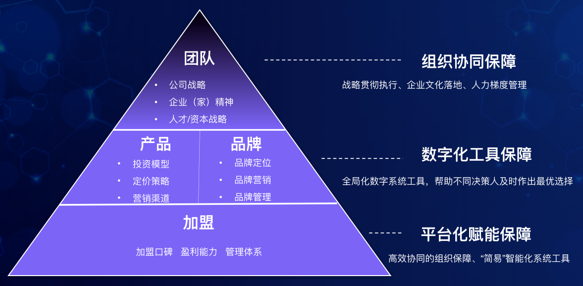 组织协同保障——战略贯彻执行、企业文化落地、人力梯度管理;数字化工具保障——全局化数字系统工具,帮助不同决策人及时作出最优选择;平台化赋能保障——高效协同的组织保障、“简易”智能化系统工具