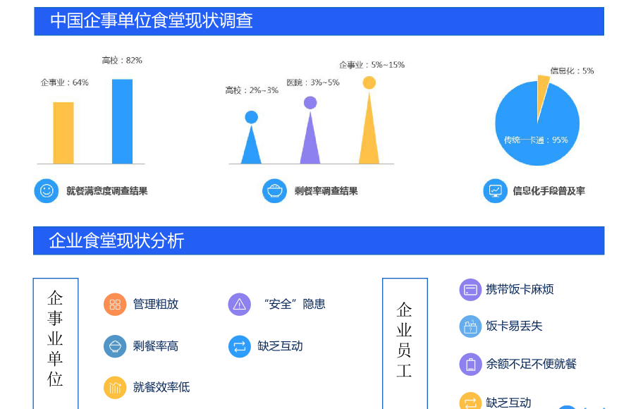 大多数企业存在食堂难以把控就餐人数,容易造成不足或浪费;饭卡充值不方便,饭卡易丢失;人员就餐不可控性,餐补情况难以把控和管理等问题。