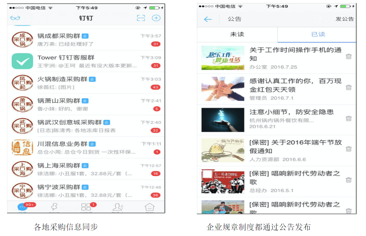 数据清晰,沟通高效。现在任何事情只要管理层在分店店长群里发条消息就能很快的传达到分店的每个人员。假如事情下发下去有员工没看到消息,就会用Ding的功能提醒没看的员工。消息传达到了后就是执行力了,作为管理层的领导也可以时时能关注到大家的一个工作状态。